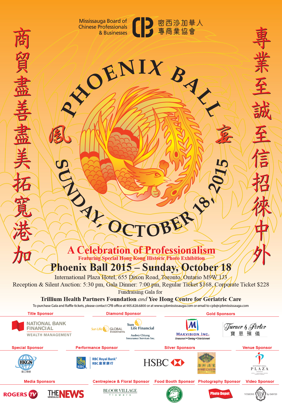 The Mississauga Board of Chinese Professionals & Business (CPB) is proud to present the 17th annual Phoenix Ball on Sunday, October 18, 2015 at the International Plaza Hotel. The Phoenix Ball is one of the largest and most prestigious Chinese-sponsored galas in Mississauga. This popular flagship event draws over 500 distinguished guests, politicians, business and professional leaders in the Greater Toronto Area and is a highlight of the social calendar in Mississauga. This year, we are pleased to partner with Hong Kong Global Network to feature the photo exhibit on a rare collection of historic Hong Kong at the gala. Since 1999, CPB and CPB Foundation have raised and donated over $2,000,000 to many charities and organizations to help various worthwhile causes. It is our commitment at CPB, CPB Foundation and the Phoenix Ball to continue to fundraise for charitable organizations and to make a difference in our community. This year, we will be fundraising Trillium Health Partners Foundation, and the Yee Hong Community Wellness Foundation. To reserve your gala tickets or tables, please complete and return the confirmation form to CPB's office by fax at (905) 828-6100 or call CPB office at (905) 828-6800 for more details. |